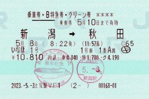 | きっぷアルバム(---/公開) 土気駅(千葉県/JR東日本) 土気駅VF1(MV50) ・ 2023/05/03 片道 在来線B 特急券 グリーン 列車1(いなほ) 85mmロール 入鋏印(新潟) 乗車記念印(秋田) |