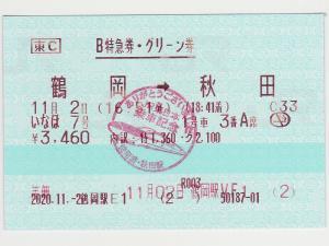 | 一般画面からの投稿(5085) 鶴岡駅(山形県/JR東日本) 鶴岡駅E1(ME4) ・ 2020/11/02 在来線B 特急券 グリーン 列車1(いなほ) 東C 85mmロール 乗車記念印(秋田) |