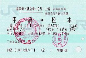 | きっぷアルバム(---/公開) 土気駅(千葉県/JR東日本) 土気駅VF1(MV50) ・ 2025/03/14 片道 特急券 グリーン 列車1(あずさ) 85mmロール 入鋏印(甲府) 乗車記念印(松本) |