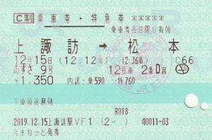 | 一般画面からの投稿(1950) 上諏訪駅(長野県/JR東日本) 上諏訪駅VF1(MV50) ・ 2019/12/15 片道 特急券 列車1(あずさ) C制 えきねっと/とれTEL 85mmロール 乗車記念印(松本) |