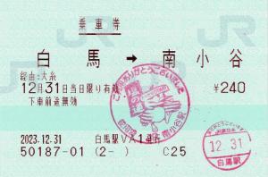 | 一般画面からの投稿(9621) 白馬駅(長野県/JR東日本) 白馬駅VA1(MV50) ・ 2023/12/31 片道 85mmロール 入鋏印(白馬) 乗車記念印(南小谷) |