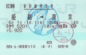 | 一般画面からの投稿(10069) 姫路駅(兵庫県/JR西日本) 姫路駅N10(MR52N) ・ 2024/06/01 新幹線 特急券 列車1(ひかり) C制 85mmロール 入鋏印(姫路) 乗車記念印(東京) |