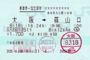 | 一般画面からの投稿(11003) 瀬戸駅(岡山県/JR西日本) 瀬戸駅MK31(MV50) ・ 2025/08/18 片道 指定席券 列車1(G丹波路快速) 85mmロール 入鋏印(大阪) 乗車記念印(篠山口) |
