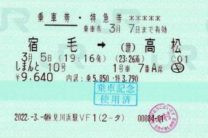 | きっぷアルバム(---/公開) 検見川浜駅(千葉県/JR東日本) 検見川浜駅VF1(MV50) ・ 2022/03/04 片道 特急券 列車1(しまんと) 85mmロール 乗車記念印(高松) |
