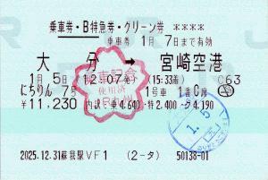 | きっぷアルバム(---/公開) 蘇我駅(千葉県/JR東日本) 蘇我駅VF1(MV50) ・ 2025/12/31 片道 在来線B 特急券 グリーン 列車1(にちりん) 85mmロール 入鋏印(大分) 乗車記念印(宮崎空港) |