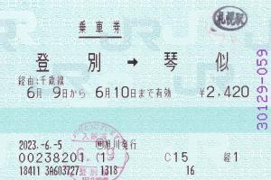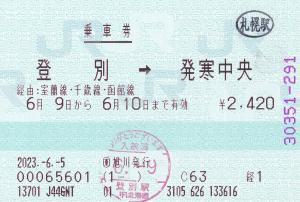 | 一般画面からの投稿(8992) 日本旅行北海道旭川支店(北海道/日本旅行北海道) (NH)旭川(感熱旅行業端末) ・ 2023/06/05 片道 口座発売 85mmプリカット 入鋏印(登別) 下車印(札幌) |