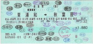 | きっぷアルバム(---/公開) 大宮駅(埼玉県/JR東日本) 大宮駅F3(MR52) ・ 2023/06/23 片道 120mmロール 入鋏印(東浦和) 下車印(南浦和,与野,さいたま新都心,大宮,新宿,新大久保,高田馬場,目白,池袋,大塚,巣鴨,駒込,田端,西日暮里,日暮里,鶯谷,上野,御徒町,秋葉原,神田,御茶ノ水,飯田橋,代々木,原宿,渋谷,恵比寿,目黒,五反田,大崎,品川,高輪ゲートウェイ,田町,浜松町,新橋,有楽町,東京) |