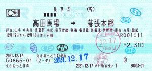 | 一般画面からの投稿(3745) 千葉駅(千葉県/JR東日本) 千葉駅E-2(ME4) ・ 2019/12/18 片道 C制 120mmロール 入鋏印(千葉,新津田沼) 下車印(津田沼) 無効印(松戸) |