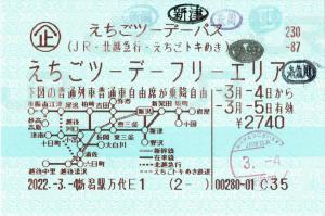 | 一般画面からの投稿(7845) 新潟駅(新潟県/JR東日本) 新潟駅万代E1(ME4) ・ 2022/03/04 本券(企230-87:えちごツーデーバス) 85mmロール 入鋏印(新潟) 下車印(新潟,新津,長岡,糸魚川) |