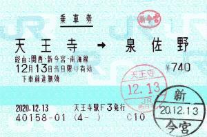 | 一般画面からの投稿(7909) 天王寺駅(大阪府/JR西日本) 天王寺駅F3(MR52) ・ 2020/12/13 片道 85mmロール 入鋏印(天王寺) 下車印(新今宮) |