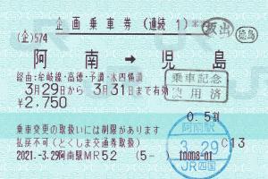 | 一般画面からの投稿(6051) 阿南駅(徳島県/JR四国) 阿南駅MR52(MR52) ・ 2021/03/29 連続 本券(企574:とくしま交通券) 85mmロール 入鋏印(阿南) 下車印(徳島,坂出) 乗車記念印 |
