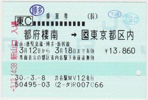 | 一般画面からの投稿(3668) 渋谷駅(東京都/JR東日本) 渋谷駅MV12(MV30) ・ 2018/03/08 片道 東C 85mmロール 下車印(博多,下関,新山口) |