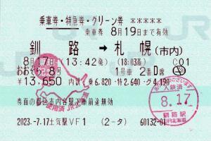 | きっぷアルバム(---/公開) 土気駅(千葉県/JR東日本) 土気駅VF1(MV50) ・ 2023/07/17 片道 特急券 グリーン 列車1(おおぞら) 85mmロール 入鋏印(釧路) 乗車記念印(札幌) |