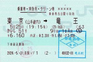 | 一般画面からの投稿(10038) 竜王駅(山梨県/JR東日本) 竜王駅VF1(MV50) ・ 2024/05/25 片道 特急券 グリーン 列車1(しおさい) 85mmロール 入鋏印(東京) 無効印(銚子) |