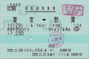 | 一般画面からの投稿(11324) 高輪ゲートウェイ駅(東京都/JR東日本) 高輪ゲートXV4(MXV10) ・ 2025/11/27 新幹線 特急券 列車1(かがやき) C制 e5489 85mmロール 入鋏印(東京) 乗車記念印 |