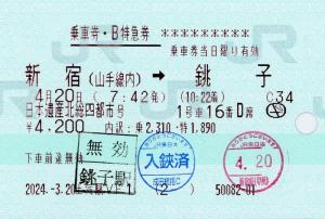 | 一般画面からの投稿(8468) 誉田駅(千葉県/JR東日本) 誉田駅VF(MV50) ・ 2022/10/06 片道 在来線B 特急券 列車1(佐原秋祭り) 東C 85mmロール 入鋏印(新宿) 無効印(佐原) |