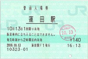| 一般画面からの投稿(656) 蓮田駅(埼玉県/JR東日本) 蓮田駅F1(MR52) ・ 2018/10/13 普通入場券 85mmロール 入鋏印(蓮田) |