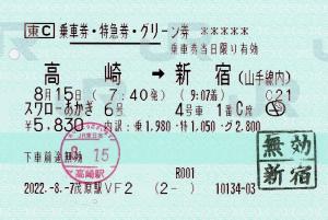 | きっぷアルバム(---/公開) 茂原駅(千葉県/JR東日本) 茂原駅VF2(MV50) ・ 2022/08/07 片道 特急券 グリーン 列車1(スワローあかぎ) 東C 85mmロール 入鋏印(高崎) 無効印(新宿) |