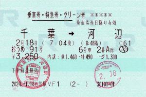 | きっぷアルバム(---/公開) 土気駅(千葉県/JR東日本) 土気駅VF1(MV50) ・ 2024/01/18 片道 特急券 グリーン 列車1(おうめ) 85mmロール 入鋏印(千葉) 乗車記念印(河辺) |