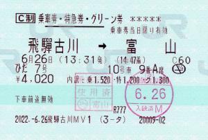 | 一般画面からの投稿(8095) 飛騨古川駅(岐阜県/JR東海) 飛騨古川MV1(MV50) ・ 2022/06/26 片道 特急券 グリーン 列車1(ひだ) C制 85mmロール 入鋏印(飛騨古川) 乗車記念印(富山) |