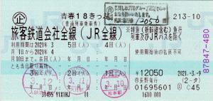| 一般画面からの投稿(5995) JTB長野店(長野県/JTB) (交)長野(感熱旅行業端末) ・ 2021/03/09 本券(企213-10:青春18きっぷ) 商制 120mmプリカット 入鋏印(松本,大月,清水) |