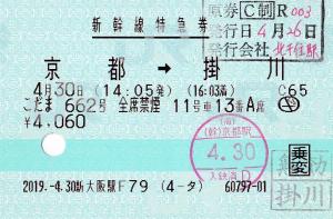 | 一般画面からの投稿(3168) 新大阪駅(大阪府/JR西日本) 新大阪駅F79(MR52) ・ 2019/04/30 新幹線 特急券 列車1(こだま) C制 乗変 85mmロール 入鋏印(京都) 無効印(掛川) |