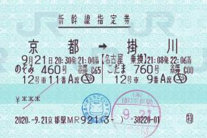 | 一般画面からの投稿(4704) 京都駅(京都府/JR東海) 京都駅MR921(MR52) ・ 2020/09/21 新幹線 指定券 列車1(のぞみ) 列車2(こだま) 85mmロール 入鋏印(京都) |