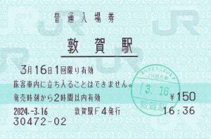 | 一般画面からの投稿(9858) 敦賀駅(福井県/JR西日本) 敦賀駅F4(MR52) ・ 2024/03/16 普通入場券 85mmロール 入鋏印(敦賀) |