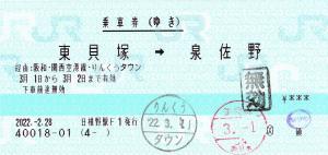 | 一般画面からの投稿(7825) 日根野駅(大阪府/JR西日本) 日根野駅F1(MR52) ・ 2022/02/28 往復 120mmロール 入鋏印(東貝塚,りんくうタウン) 下車印(りんくうタウン) 無効印 |