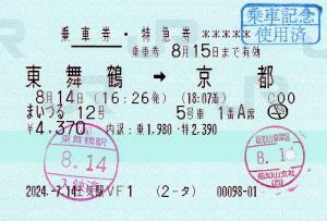 | きっぷアルバム(---/公開) 土気駅(千葉県/JR東日本) 土気駅VF1(MV50) ・ 2024/07/14 片道 特急券 列車1(まいづる) 85mmロール 入鋏印(東舞鶴) 乗車記念印(京都) |