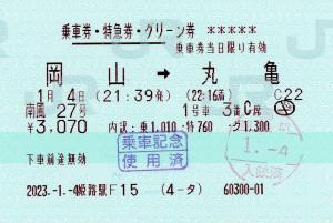 | 一般画面からの投稿(8623) 姫路駅(兵庫県/JR西日本) 姫路駅F15(MR52) ・ 2023/01/04 片道 特急券 グリーン 列車1(南風) 85mmロール 入鋏印(岡山) 乗車記念印(丸亀) |