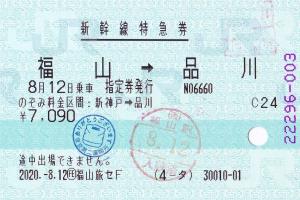 | 一般画面からの投稿(4367) JFEライフ福山旅行センター(広島県/JFEライフ) (FE)福山旅セF(MR51) ・ 2020/08/12 新幹線 特急券 席無 85mmプリカット 入鋏印(福山) |