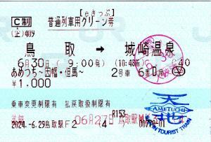 | 一般画面からの投稿(10135) 鳥取駅(鳥取県/JR西日本) 鳥取駅F2(MR52) ・ 2024/06/29 普通列車グリーン 列車1(あめつち~因幡・但馬~) 本券(企409:eきっぷ) C制 85mmロール 入鋏印(鳥取) |