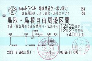 | 一般画面からの投稿(5442) 松江駅(島根県/JR西日本) 松江駅F1(MR52) ・ 2020/12/26 本券(企554-50:GoToトラベル地域共通クーポン限定自由周遊きっぷ(鳥取・島根エリア)) 85mmロール 入鋏印(境港) |