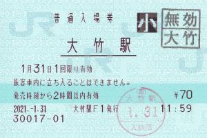 | 一般画面からの投稿(5652) 大竹駅(広島県/JR西日本) 大竹駅F1(MR52) ・ 2021/01/31 普通入場券 こども 85mmロール 入鋏印(大竹) 無効印(大竹) |