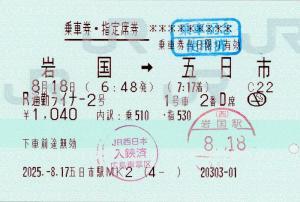 | 一般画面からの投稿(11005) 五日市駅(広島県/JR西日本) 五日市駅MK2(MV50) ・ 2025/08/17 片道 指定席券 列車1(R通勤ライナー) 85mmロール 入鋏印(岩国) 乗車記念印(広島) |