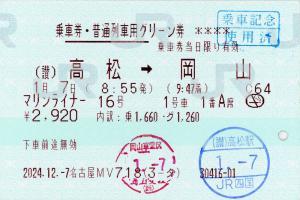 | きっぷアルバム(---/公開) 名古屋駅(愛知県/JR東海) 名古屋MV718(MV50) ・ 2024/12/07 片道 普通列車グリーン 列車1(マリンライナー) 85mmロール 入鋏印(高松) 乗車記念印(岡山) |
