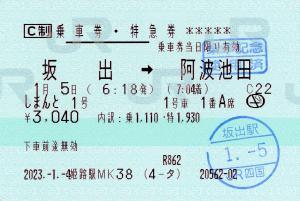 | 一般画面からの投稿(8622) 姫路駅(兵庫県/JR西日本) 姫路駅MK38(MV50) ・ 2023/01/04 片道 特急券 列車1(しまんと) C制 85mmロール 入鋏印(坂出) 乗車記念印(阿波池田) |