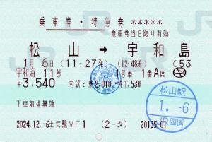 | 一般画面からの投稿(8624) 丸亀駅(香川県/JR四国) 丸亀駅MV51(MV50) ・ 2023/01/04 片道 特急券 列車1(宇和海) C制 85mmロール 入鋏印(松山) |