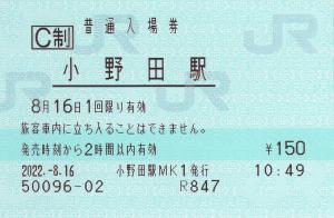 小野田駅改札付近の指定席券売機にて発行の入場券です。