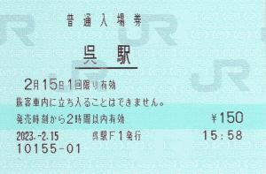 呉駅みどりの窓口にて発行の入場券です。